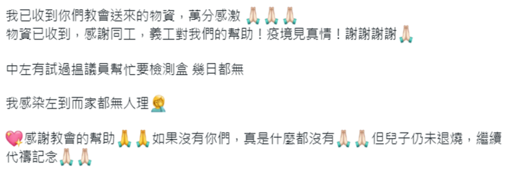 有街坊經其他街坊介紹,冒昧WhatsApp教會求救,教會送上物資後,該街坊專誠打電話到教會聯絡同工,好感動地向大家表達衷心的謝意,特別物資很重,很感謝義工的勞苦。他表示希望在痊癒後,教會重開之日,到訪教會崇拜及做義工。
